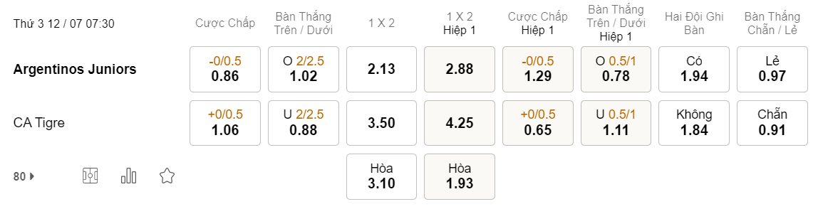 Soi kèo hiệp 1 Argentinos Juniors vs Tigre: 1.29*0/0.5*0.65