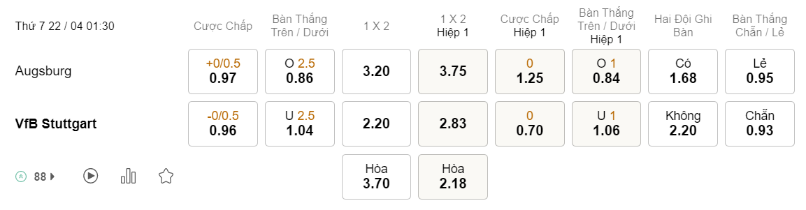 Tỉ lệ kèo Augsburg vs Stuttgart