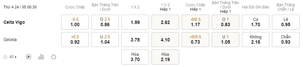 Soi kèo hiệp 1 Celta Vigo vs Girona: 1.17*0/0.5*0.73