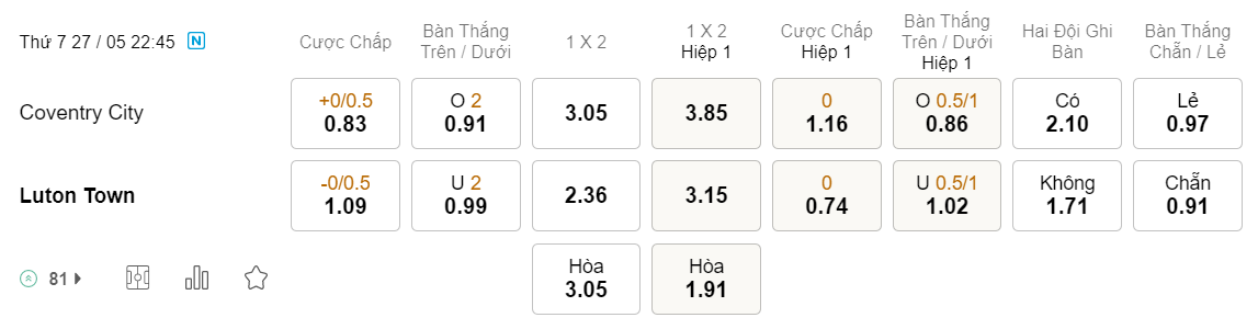 Tỉ lệ kèo Coventry vs Luton