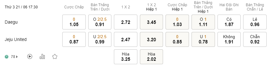 Soi kèo tài xỉu Daegu vs Jeju United: 0.91*2/2.5*0.99