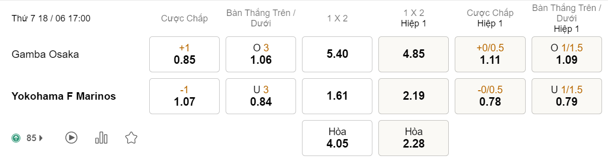Soi kèo châu Á Gamba Osaka vs Yokohama Marinos: 0.85*1*1.07