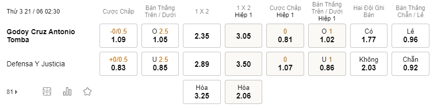 Tỉ lệ kèo Godoy Cruz vs Defensa Justicia