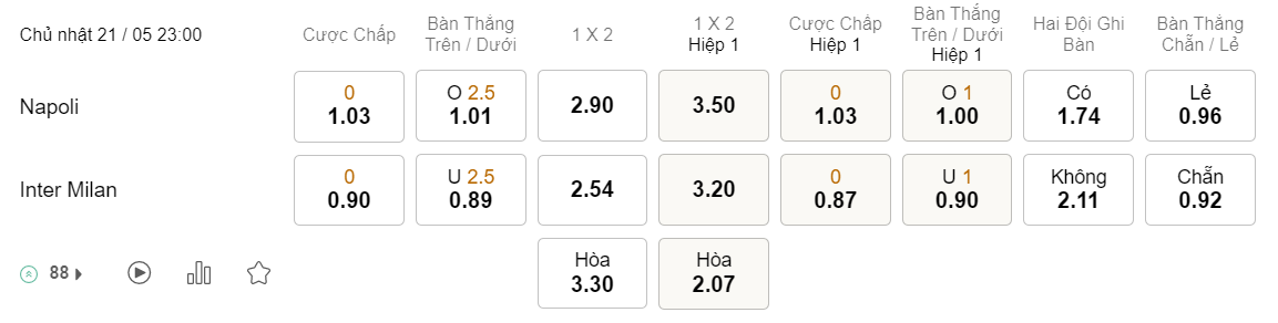 Tỉ lệ kèo Napoli vs Inter