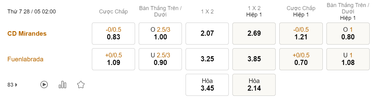 Soi kèo châu Á Mirandes vs Fuenlabrada: 0.83*0/0.5*1.09