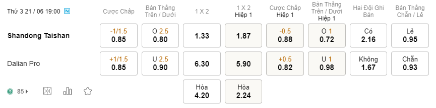 Soi kèo châu Á Shandong Taishan vs Dalian Pro: 0.85*1/1.5*0.85
