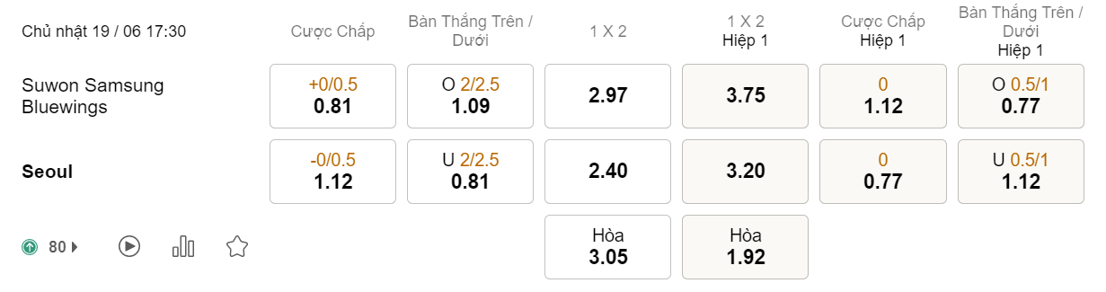 Soi kèo châu Á Suwon Bluewings vs Seoul: 0.81*0/0.5*1.12