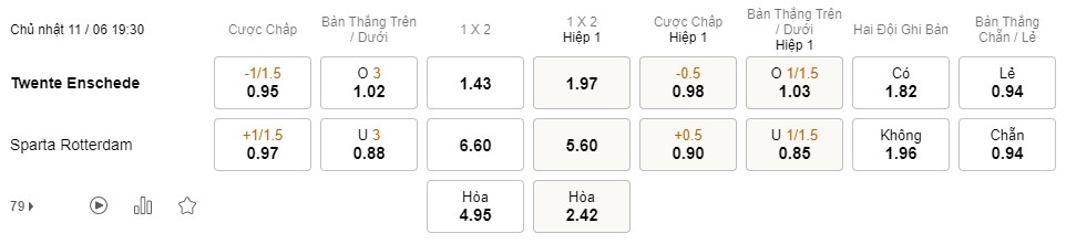 Tỉ lệ kèo Twente vs Sparta Rotterdam