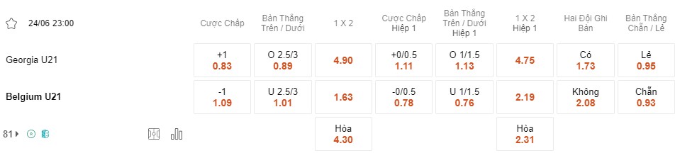 Tỉ lệ kèo U21 Georgia vs U21 Bỉ