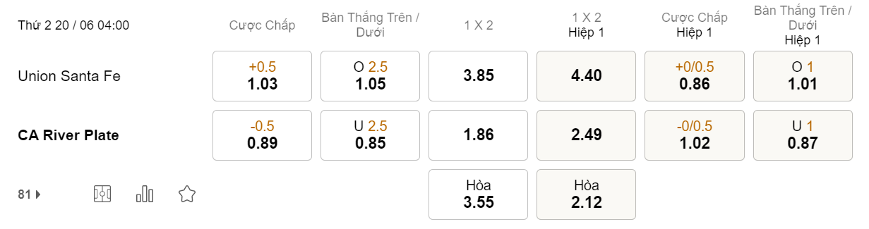 Soi kèo hiệp 1 Union vs River Plate: 0.86*0/0.5*1.02
